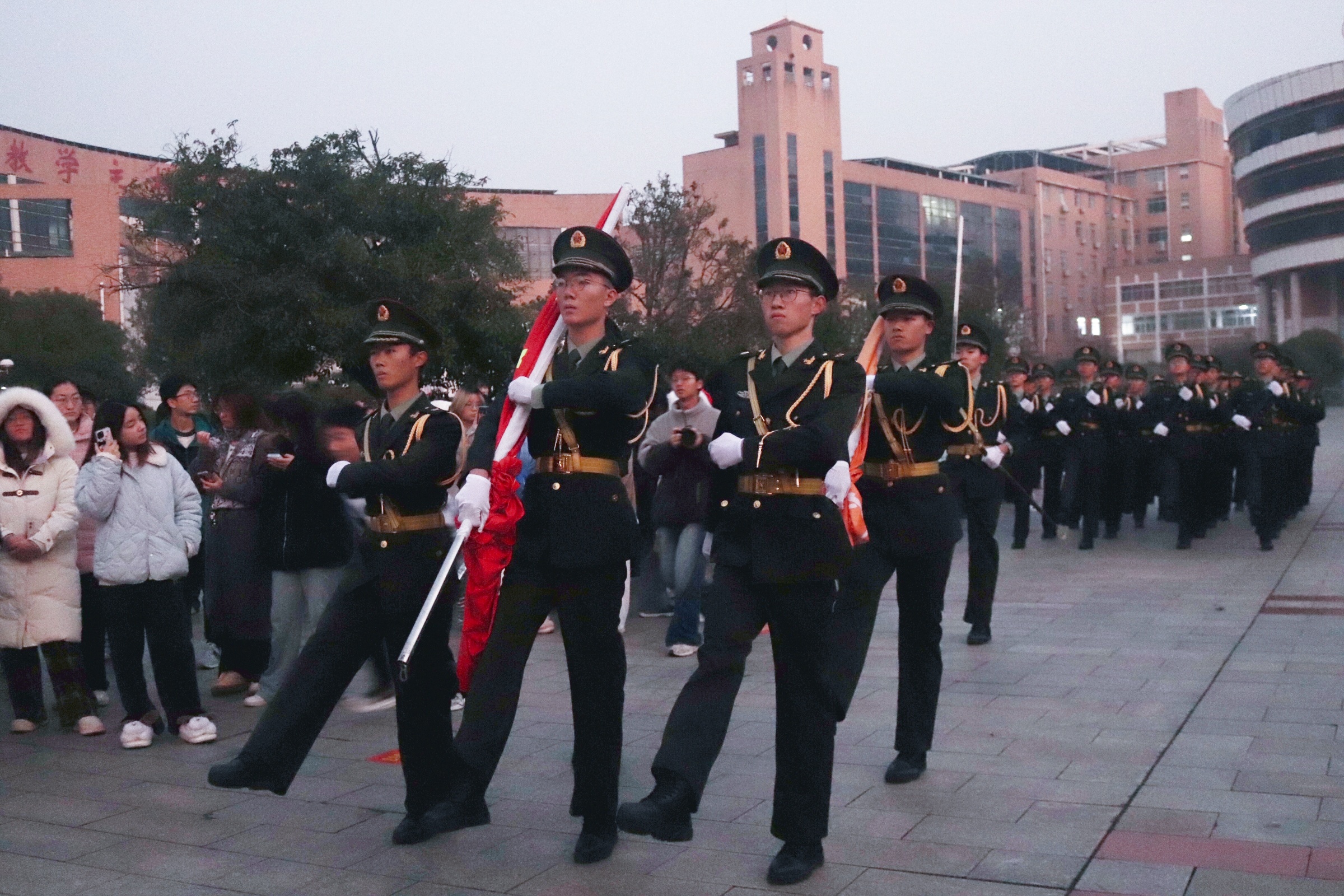 清晨时分,学院师生肃立成列,精神抖擞。国旗护卫队队员们踏着铿锵有力的步伐走向旗杆,在初升的阳光下,一场庄严的升旗仪式拉开帷幕。
