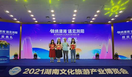 由湖南省文化和旅游厅、长沙市人民政府主办的“锦绣潇湘 遇见浏阳”第四届湖南文化旅游创新创意大赛颁奖典礼暨成果展于湖南国际会展中心隆重举行,本次活动也是2021年湖南旅博会的八大主体活动之一。颁奖典礼上,我校伟德国际victor1946胡大虎老师指导的熊萍、李海芬、李海煜、潘福华,杨鹏、张彪、陈雅琪,何婷婷、唐碧婷、李梦斌等学生组成的三个设计团队分获大赛银奖一个、铜奖二个,获总奖金四万元,我校是本次比赛获奖最多的单位。在颁奖活动现场的大赛优秀作品转化签约环节中,湖南文化创意有限公司与我院设计团队指导老师及相关文创文旅企业签订了转化协议,促进大赛获奖作品迅速转化成产品,服务于社会和企业。