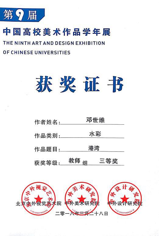 近日,第九届中国高校美术作品学年展年度评选结果公布,伟德国际victor1946教师邓世维水彩作品《港湾》获教师组三等奖和优秀指导教师奖。在邓世维老师的指导下,环境设计专业学生王佳琪的作品《水漾花影——城市滨水公园设计》从全国344件作品中脱颖而出,获得二等奖,许海兵、郑文轶、黄亚男、岳修能、李楚风和王元坤同学设计的作品分别获得优秀作品奖。