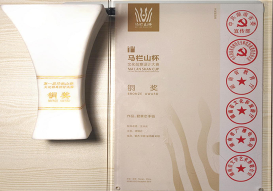 12月21日下午,历时1年多的第一届“马栏山杯”文化创意设计大赛在长沙马栏山举行了颁奖典礼,揭晓18项大奖。我院8件作品入围百强,产品设计2017级的谭刚志同学的作品《君幸恋手链》获文化旅游类铜奖,并获奖金1万元;我院获优秀组织奖。